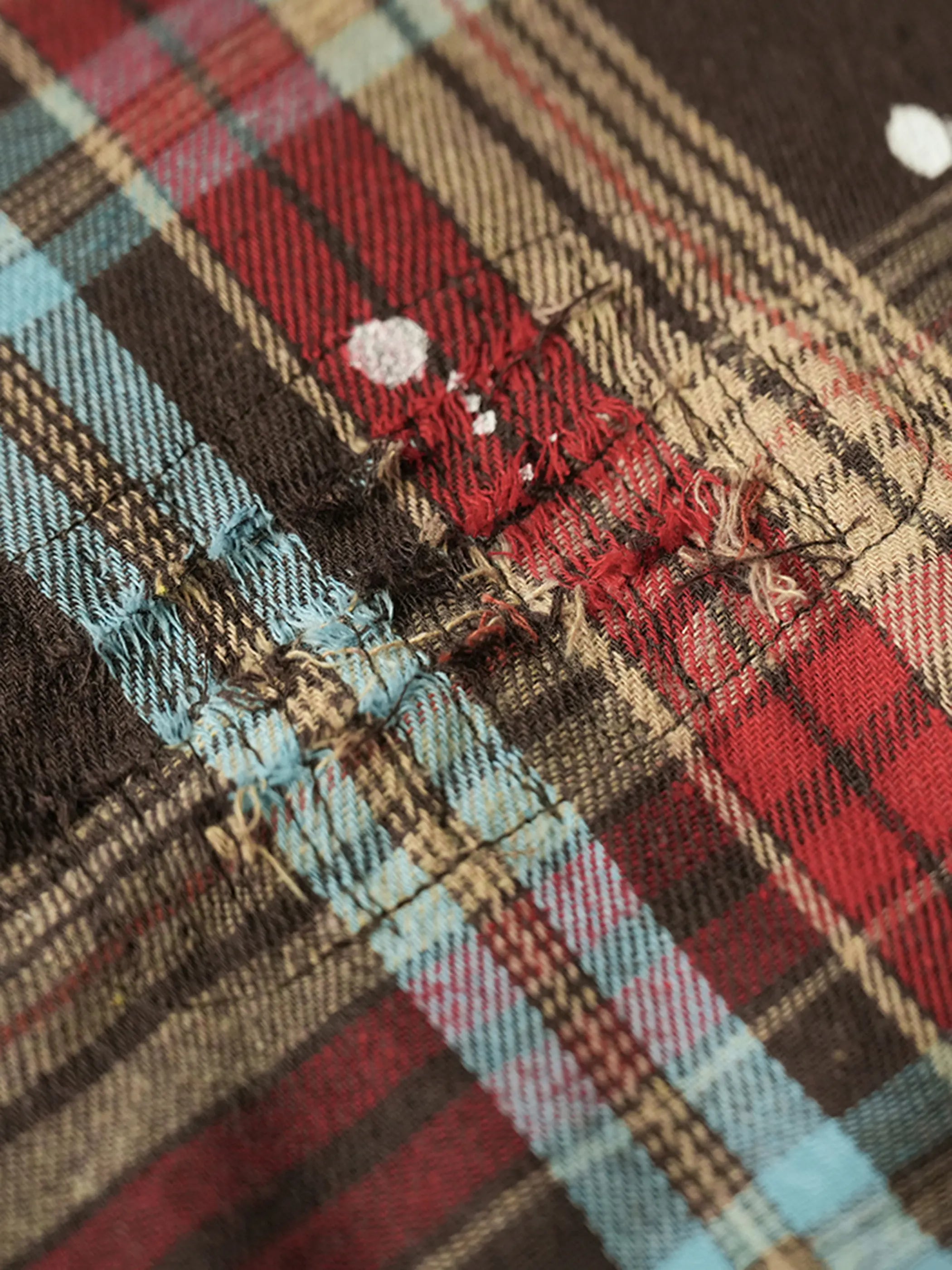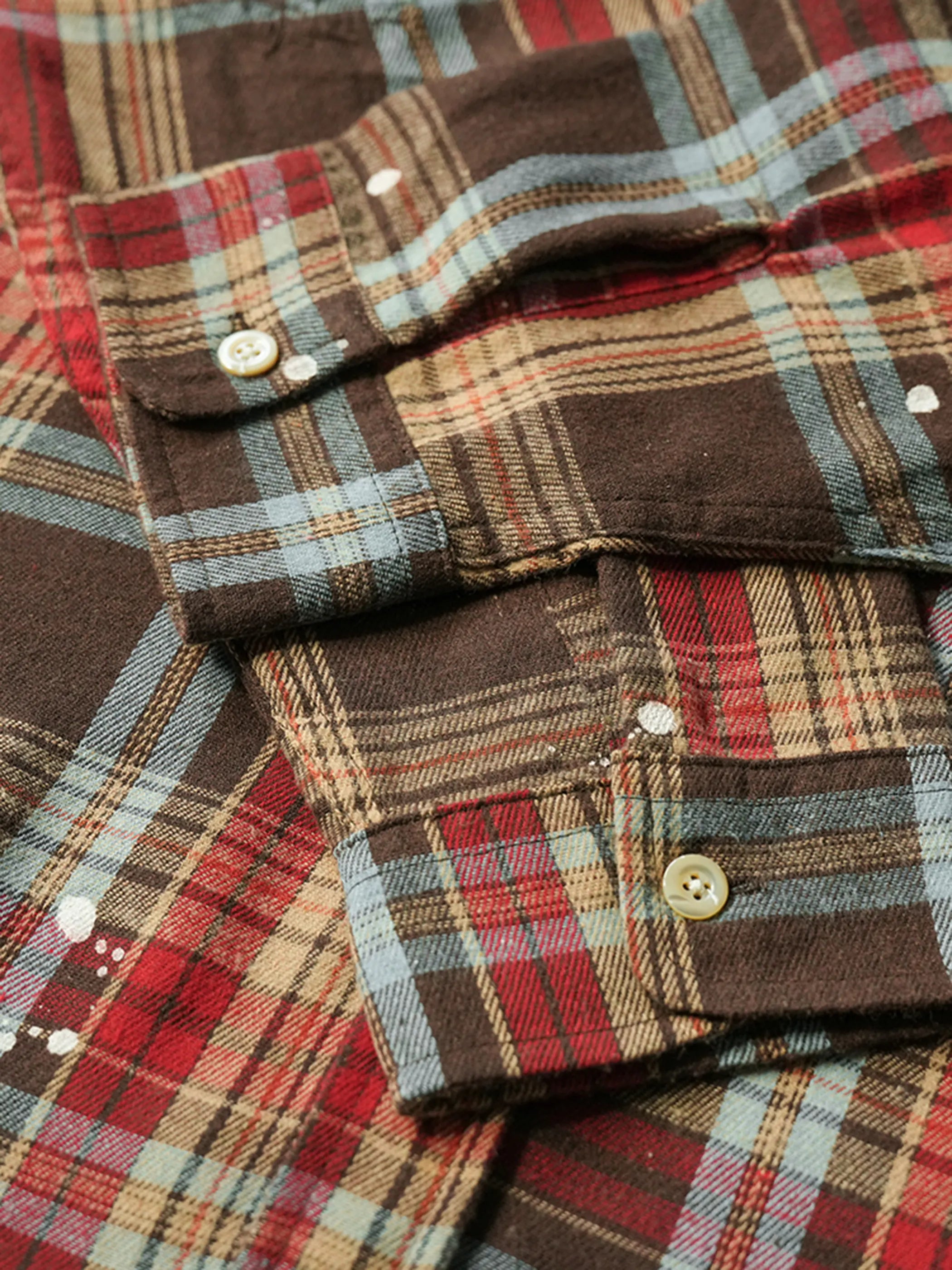 부드러운 기모 코튼 플란넬 원단에 워시드 빈티지 효과와 핸드 디스트레스트 패치를 적용해 자연스러운 올드스쿨 감성을 살렸으며, 컬러 대비 패치워크와 불규칙 페인트 스플래터 디테일이 클래식 워크 셔츠 구조에 감각적인 개성을 더해 데님 또는 코튼 팬츠와 매치할 때 여유로운 도시적 분위기를 연출합니다.