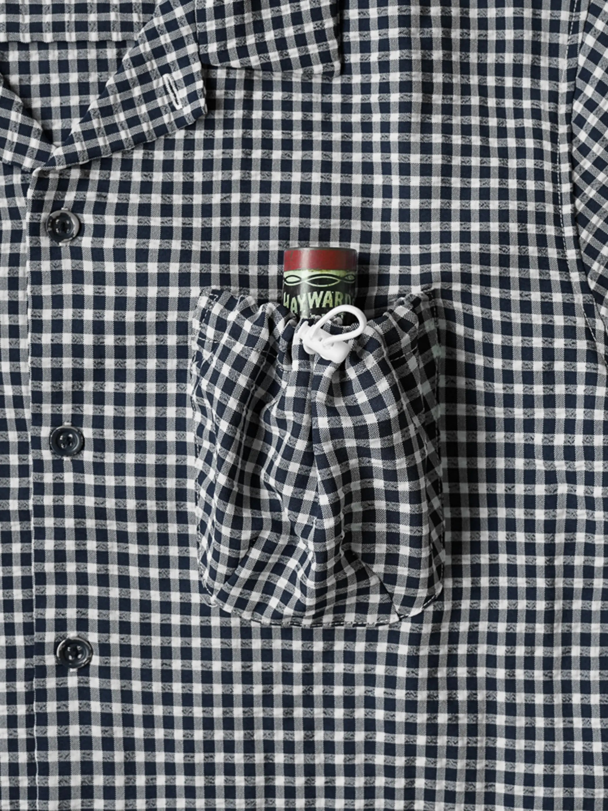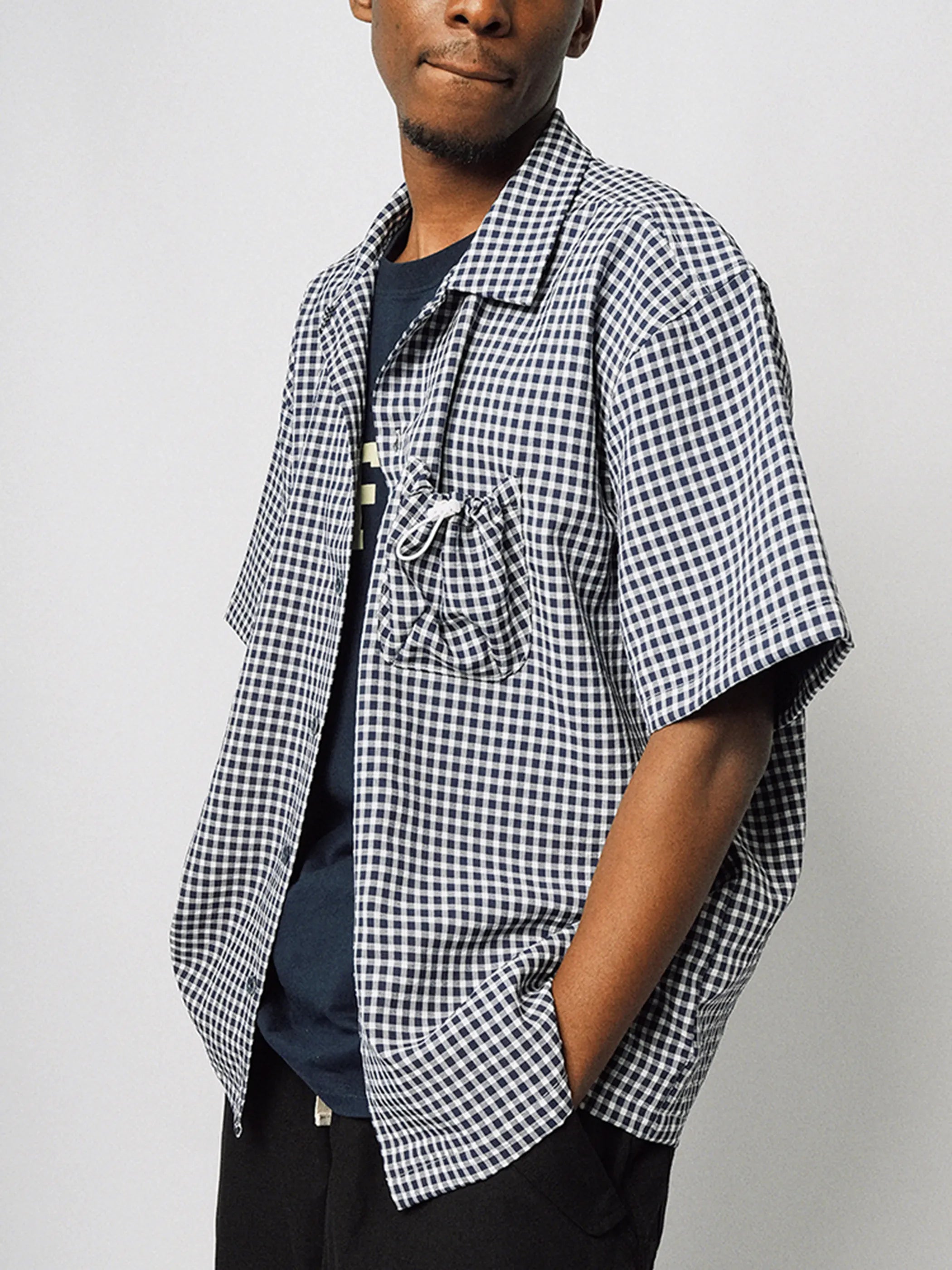 부드러운 네이비 체크 버블 거즈와 포켓 드로우스트링 디테일이 돋보이는 여유로운 쿠바 칼라 셔츠입니다.