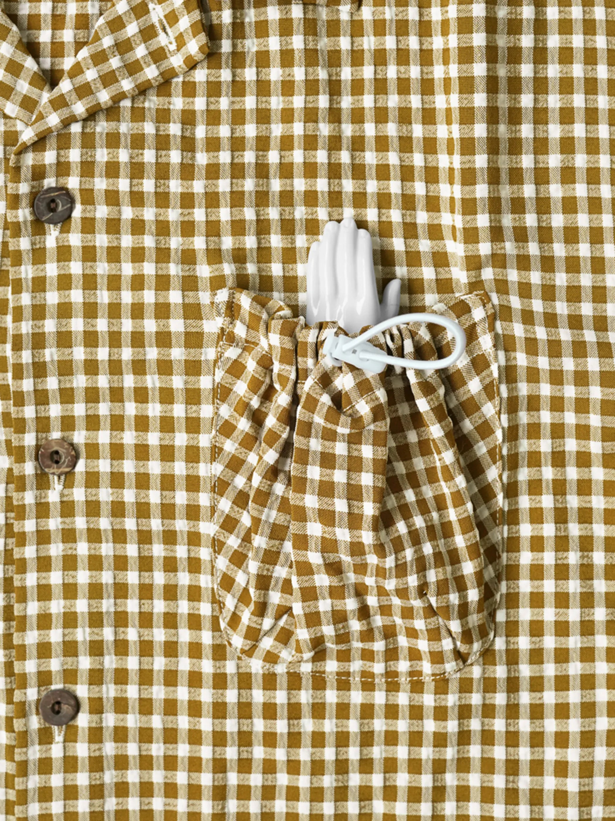 부드러운 머스타드 깅엄 시어서커 버블 거즈 원단과 클래식 쿠바 칼라가 어우러진 여유로운 반팔 셔츠입니다.