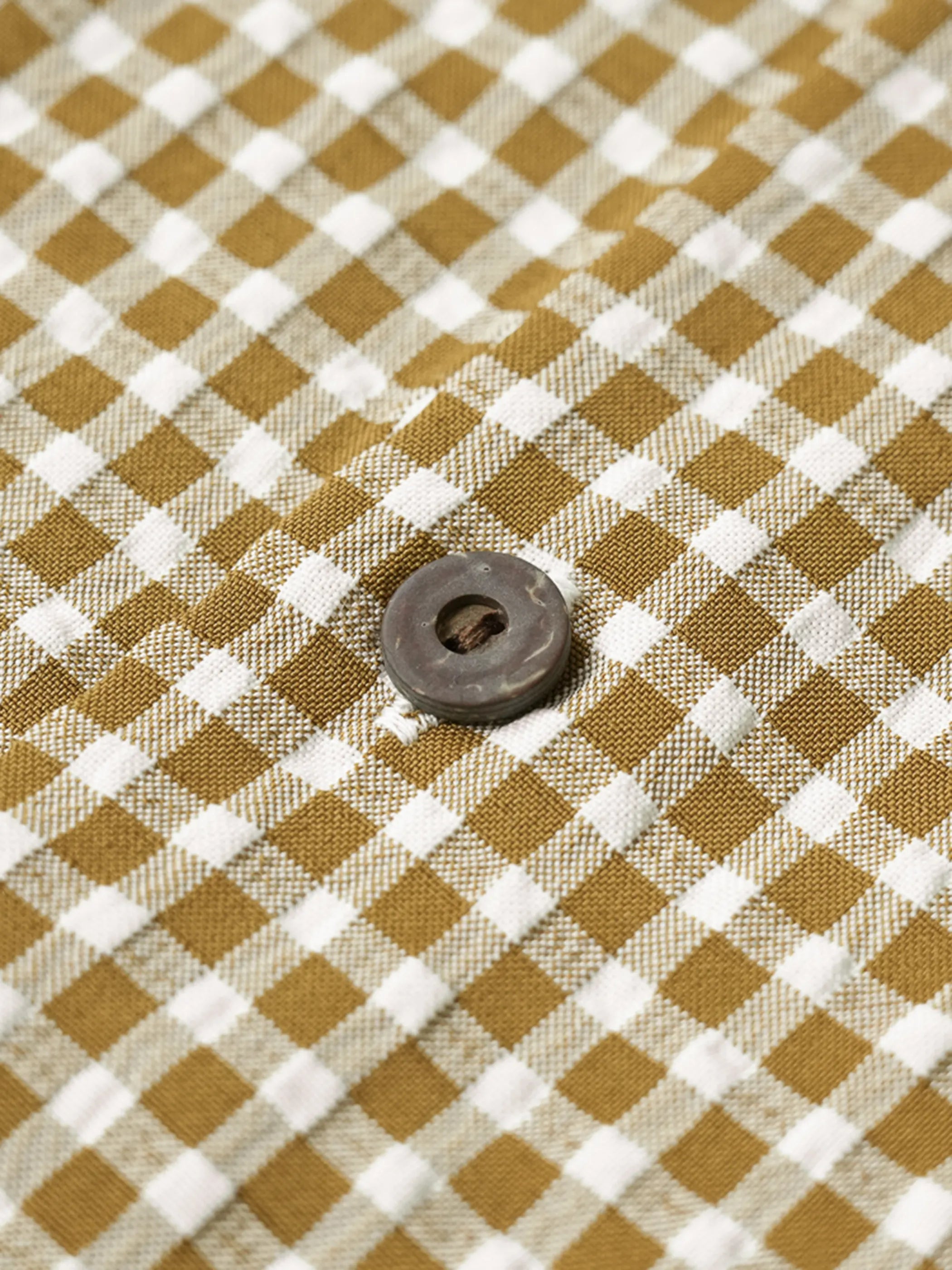 통기성과 가벼움을 강조하는 머스타드 깅엄 시어서커 버블 거즈 원단이 쾌적함을 제공하며 1960년대 남부 리조트 셔츠에서 영감받은 쿠바 칼라와 포켓 스트링 디테일, 천연 코코넛 버튼이 도시적 레트로 무드를 완성해 데님 또는 리넨 슬랙스와 매치 시 감성적 여유를 선사합니다.