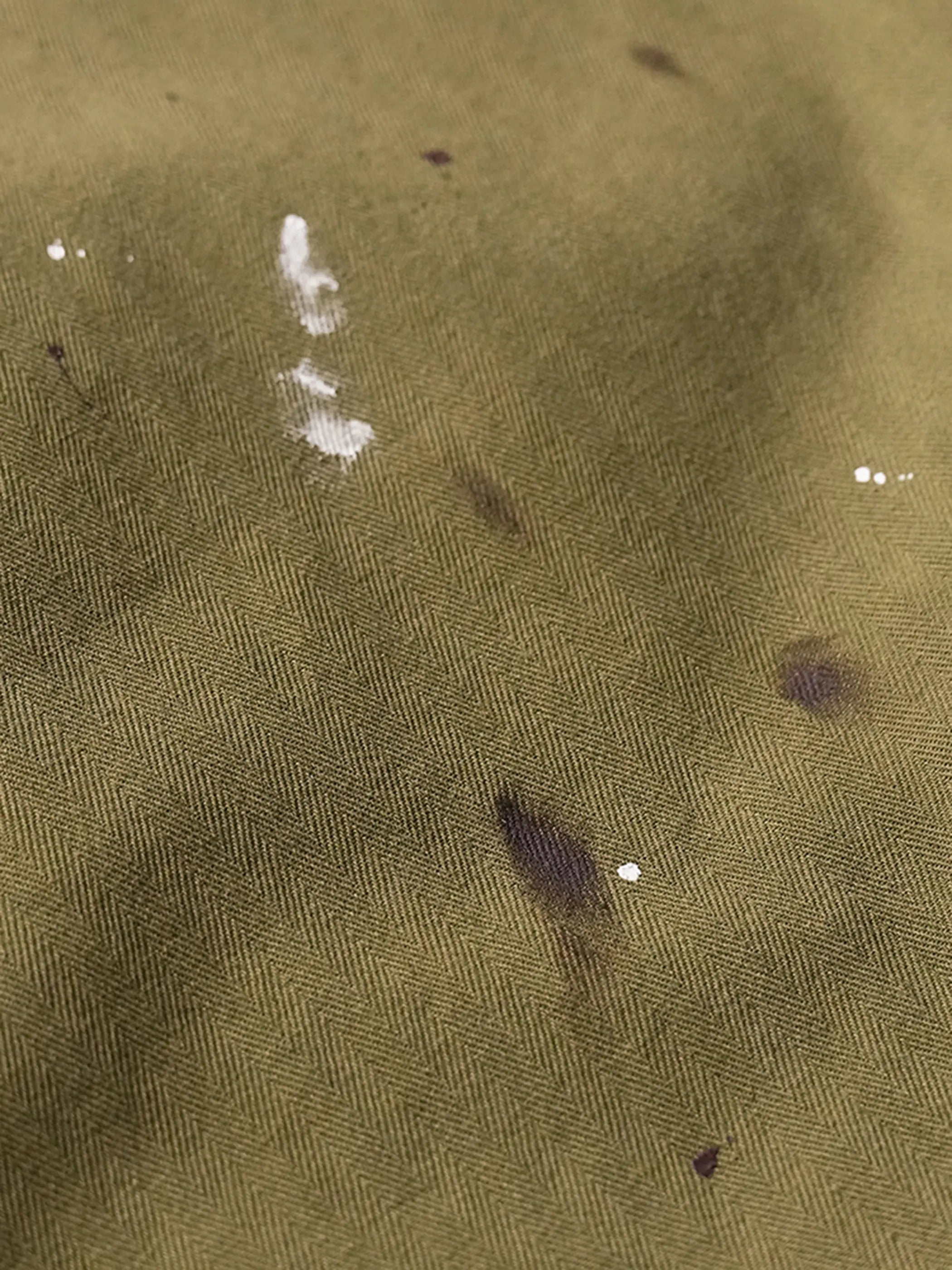 전통 밀리터리 M-45 필드 팬츠 구조를 현대적으로 재해석해 올리브 헴프 헤링본 코튼 원단에 클린 워시드 및 핸드 페인팅 스플래터를 적용했으며, YKK™ 메탈 지퍼와 천연 소뿔 버튼이 고급스러움을 더해 편안한 활동성과 빈티지 감성을 동시에 선사합니다.