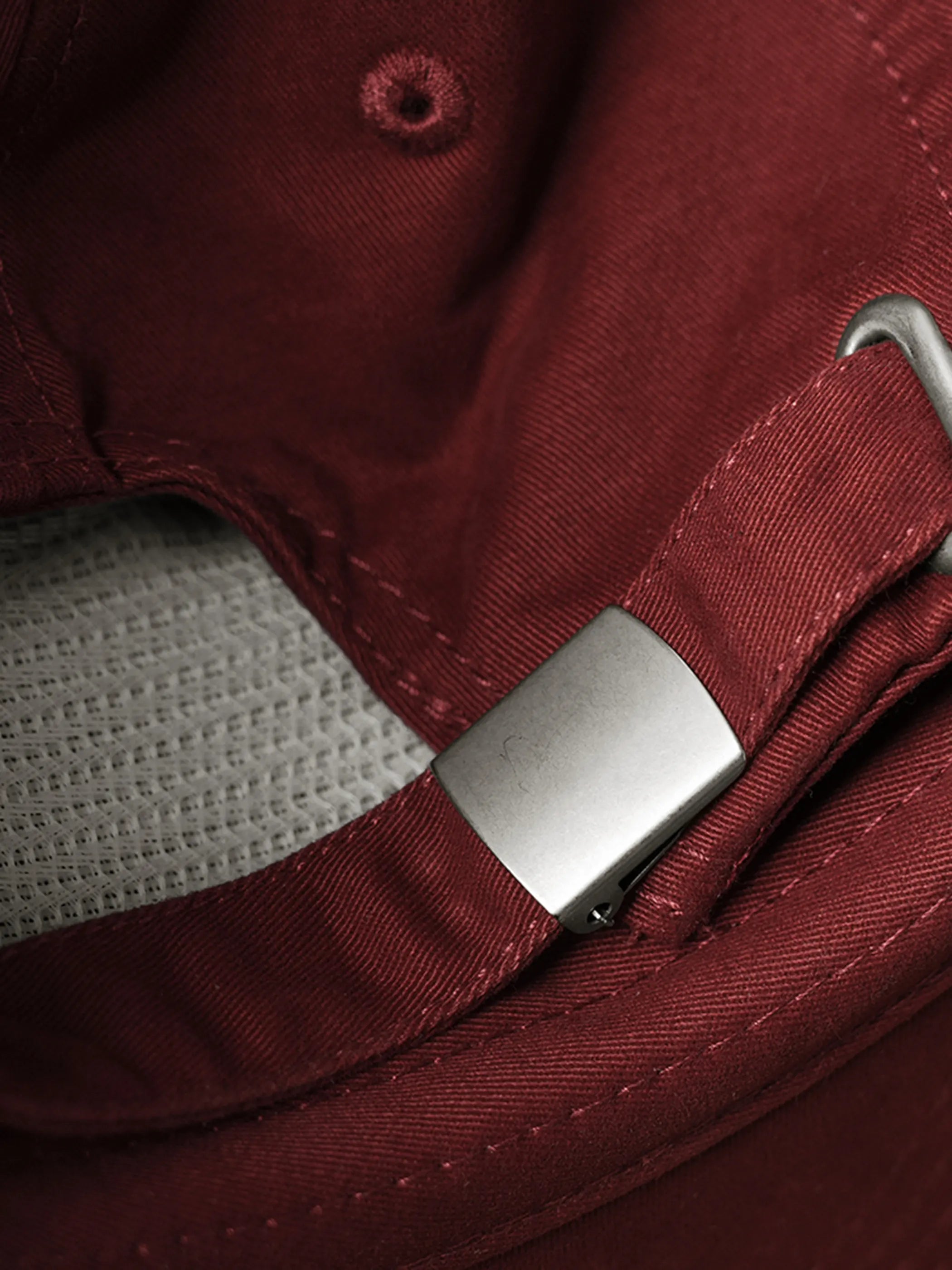 90년대 평 브림 야구 모자에서 영감받은 딥 레드 코튼 트윌 캡으로 도시적 레트로 무드를 완성합니다.