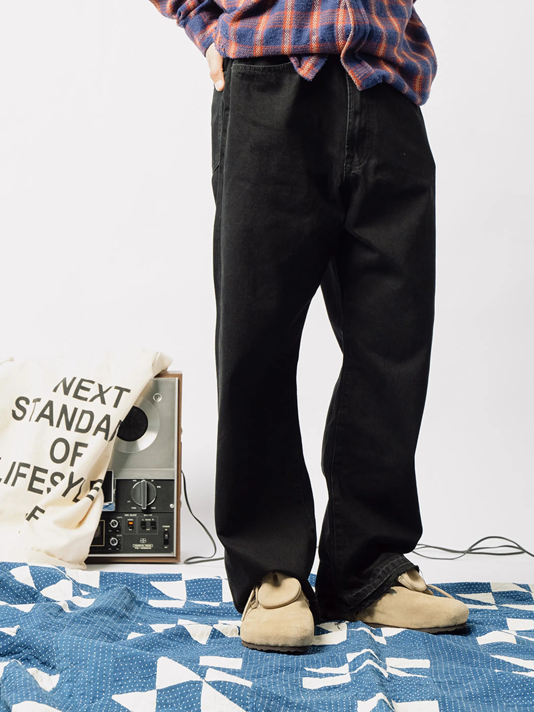 빈티지 무드의 워시드 레드 셀 데님을 사용한 루즈 스트레이트 진입니다.
